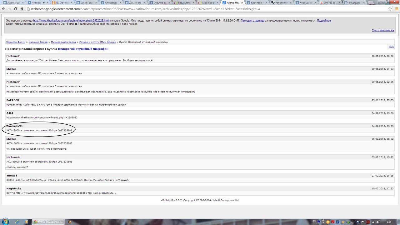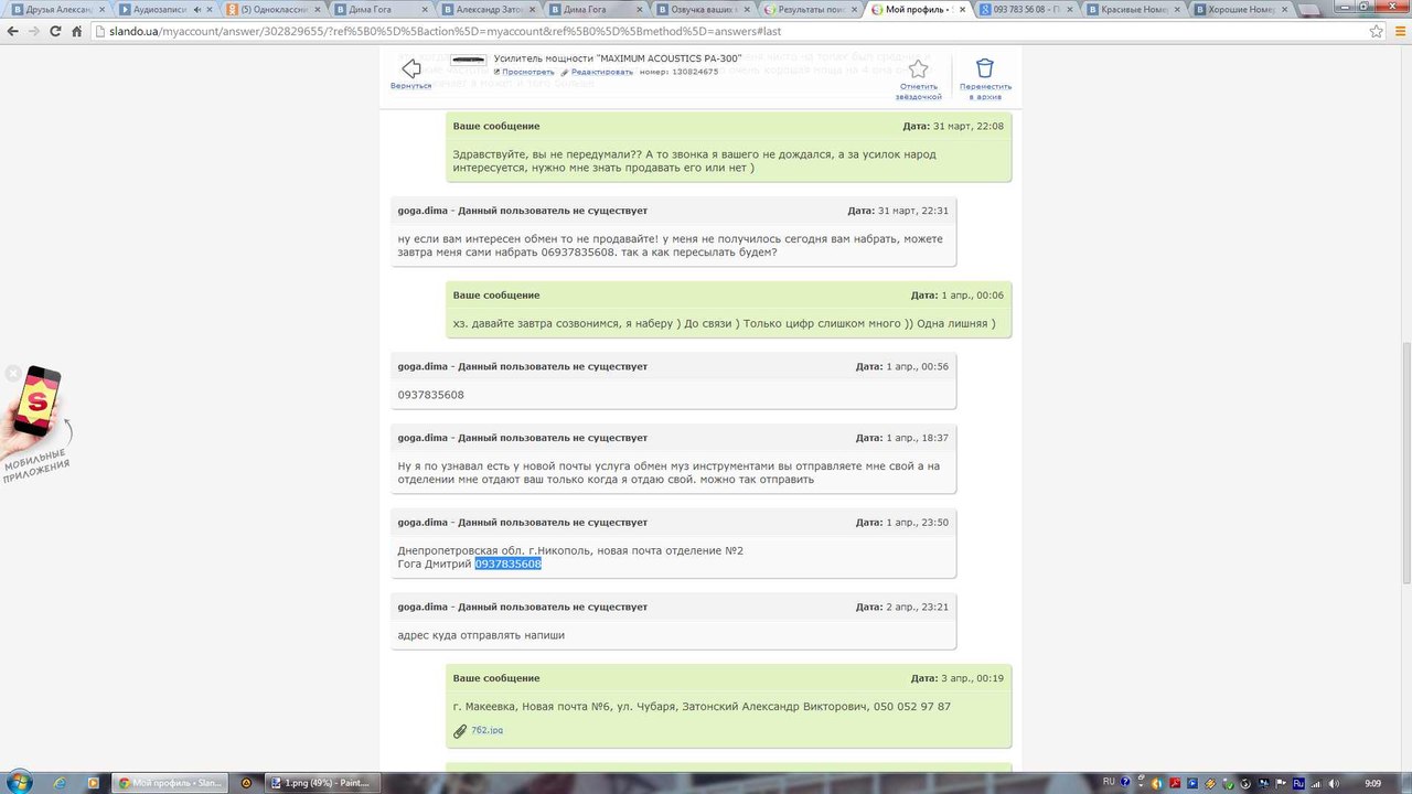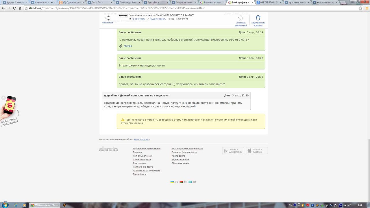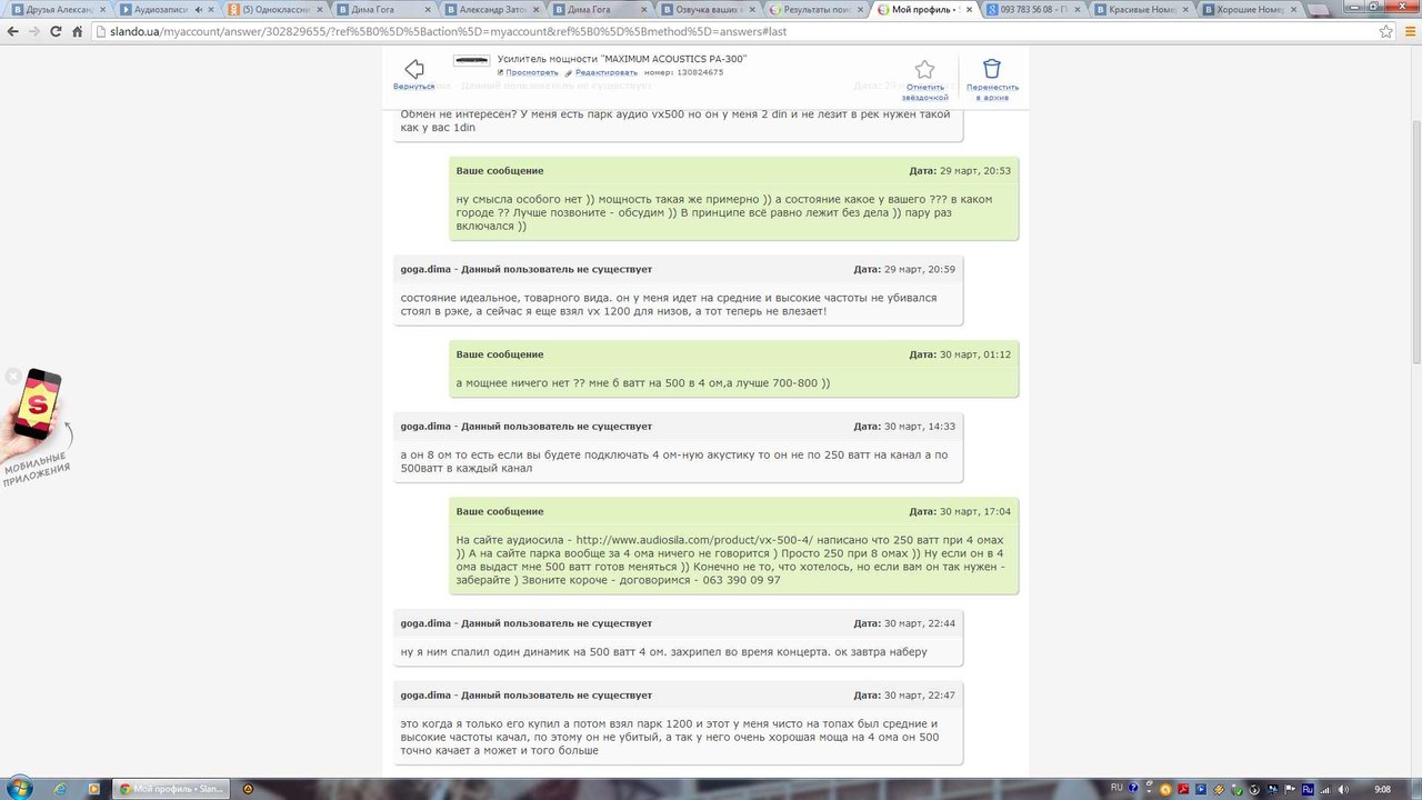 Внимание !!! В Харькове завёлся кидалово !!! Просьба максимального репоста http://vk.com/id13811760?w=wall13811760_3069%2Fall !!!! Дмитрий Гога, номера телефонов - 0937835608, 0668519746. Может появляться в сети под никами: "Dimon4ik93", "dima.goga", и другими. Решили обменяться усилителям, я выслал ему Новой почтой новенький "Maximum acoustics pa-300" он взамен должен был прислать "Park audio VX 500", для этого он зачем-то даже поехал в Днепропетровскую область в г. Никополь. Я, как добропорядочный человек, свои обязательства выполнил. То, что он мне прислал можете глянуть в прикреплённых фотографиях, это обычный кусок железа (( Номер телефона поменял, все свои объявления удалил, но я таки кое что нашёл, ниже прилагаю страницы в инете имеющие к этому козлу отношение. Помню, что продавал он на Slando в Никополе кучу динамиков и мастеровой усилитель, но это для вида скорее всего. Сейчас свою страницу на этом сайте он удалил. http://www.odnoklassniki.ru/profile/557846704827http://vk.com/dima_gogahttp://vk.com/public52261558http://hi-fidelity-forum.com/forum/thread-43353.htmlhttp://hi-fidelity-forum.com/forum/thread-43355.htmlhttp://hi-fidelity-forum.com/forum/thread-....html#pid876584 (IMG: img?url=http://cs408216.vk.me/v408216114/8649/kFVQbEkfEGM.jpg) (IMG: img?url=http://cs14106.vk.me/c605427/v605427760/7124/MlAjEQZzrEY.jpg) (IMG: img?url=http://cs14106.vk.me/c605427/v605427760/712e/ONYc5H4HQRo.jpg) (IMG: img?url=http://cs14106.vk.me/c605427/v605427760/7138/3hQaY4AZHhE.jpg) (IMG: img?url=http://cs14106.vk.me/c605427/v605427760/7142/KUCIFopP6_w.jpg) (IMG: img?url=http://cs14106.vk.me/c605427/v605427760/714c/2LluNa6uLis.jpg) (IMG: img?url=http://cs14106.vk.me/c605427/v605427760/7156/2HJ1D3pPbUw.jpg) (IMG: img?url=http://cs14106.vk.me/c605427/v605427760/716a/onjzngM6mKU.jpg) (IMG: img?url=http://cs14106.vk.me/c605427/v605427760/717e/P7HTGYByS78.jpg)