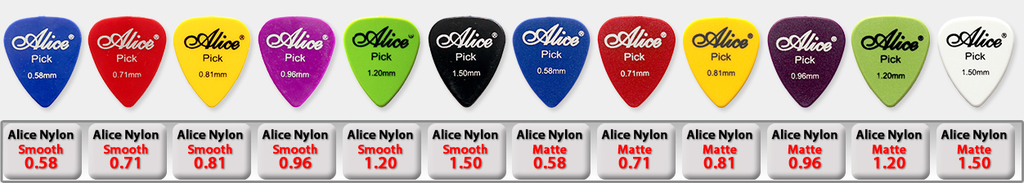 В наличии так же есть медиаторы Alice Nylon 0,58mm - 1,5mm и медиаторы Alice Celluloid.