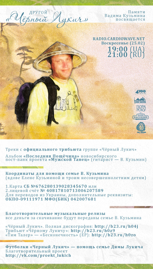 Другой «Чёрный Лукич» Цикл мероприятий, проведенных при участии нашего дуэта в поддержку семьи (супруги Елены и троих несовершеннолетних детей) Вадима Петровича Кузьмина, покойного лидера группы "Чёрный Лукич", завершится моим авторским подкастом на волнах одесского радио CardioWave. В грядущее воскресенье, с 19:00 до 20:00 в эфире онлайн-радио прозвучат несколько композиций с официального «Трибьюта Чёрному Лукичу, выпущенного в 2012 г. творческим объединением «Донбасс Андеграунд», а также песни с пост-панк-альбома «Последняя Пощёчина», которым завершил свою деятельность «Мужской Танец»— наиболее экзотический и «прозападный» проект Вадима Кузьмина. Возможны сюрпризы. Надеюсь, они будут исключительно приятными. В любом случае, аудиторию радио CardioWave ожидает минимум говорильни, но максимум хорошей и неожиданной музыки. |