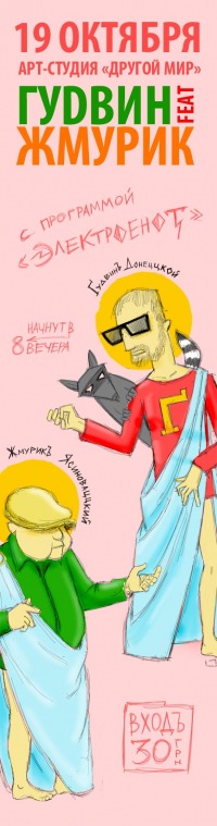 В пятницу, 19 октября, Гудвин выступает в печально известном заведении "Другой мир" в Донецке - http://vk.com/dm_donetsk, начало в 20.00, вход - 30 грн. Состав музыкантов: Гудвин - вокал, кривляния, танцы-шмансы, реп и прочее Жмурик - бац гитара Валерыч Скачков - барабаны Затон - гитара (с дисторшеном !!! ) некто Степан - перкуссия Приходите ) (IMG:img?url=http://cs317725.userapi.com/g43617437/a_5e004a3e.jpg) Сообщение отредактировал zaton - 17.10.2012, 23:02 |