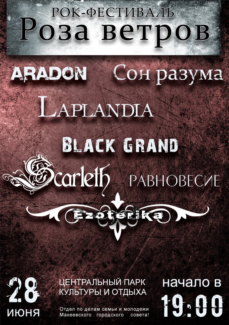 28 ИЮНЯ 2009, в 19:00 , в славном городе Макеевка, в Центральном Парке Культуры и Отдыха (Северный парк) пройдет РОК-ФЕСТИВАЛЬ "Роза Ветров". Участники: |...Ezoterika...| Scarleth Равновесие Сон Разума LAPLANDIA ARADON Событие вконтакте: http://vkontakte.ru/event10261569 (IMG: style_emoticons/default/victory.gif) По вопросам "как добрать до места": "C Донецка - С крытого на 107-м или 121-м маршруте до конечной остановки. Затем, если на 107-м ехал, пересаживаешься на 1-й или 2-й номер автобуса и едешь до остановки "92-х квартирный". А лучше спросить, остановит ли водила на Парке, он чуть дальше... Если на 121-м, то все то же самое, только меняются марки маршрутов: садишься либо на маршрутку №1. либо №34..." "еще вроде можно на 111 с Южного.а там все теми же 1 и 2 автобусом."
