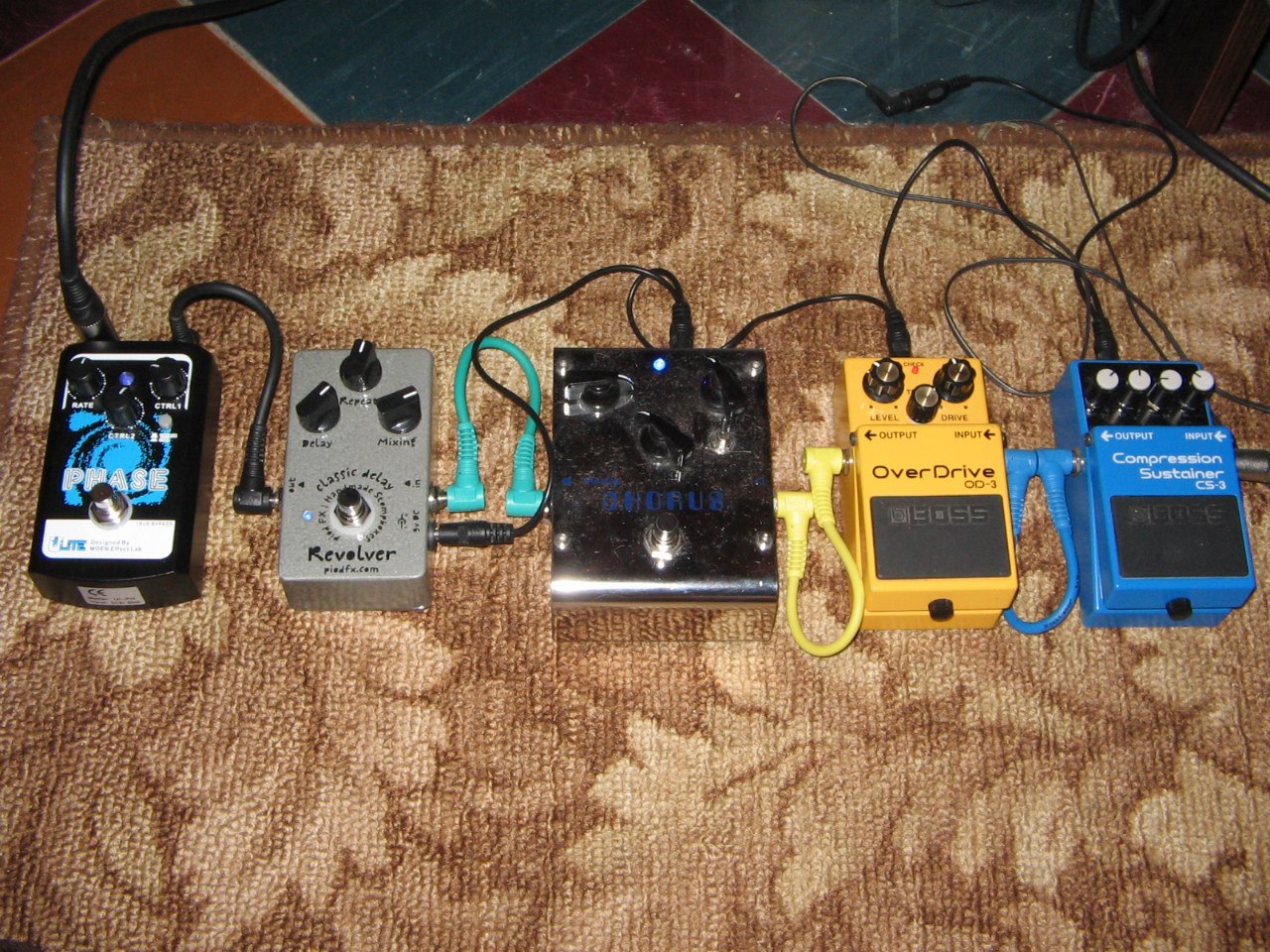 Вот моё барахло: фендер мекс 02 года, на гилморовскую палку похожа слегка )) звучит хорошо даже со стоковыми датчиками, но в перспективе хочу поменять их. И педали... 1. Moen - analog phaser - изумительный фейзер, даёт фору всякой срани типа MXR и прочим дорогим фирмам. 2. Piodfx - revolver analog delay - копия мед профессорского дилея.. 3. Biyang ch8 analog chorus - мне он даже по звуку больше боссовского понравился, глубже звук что-ли, а цена копейки. 4. Boss Od-3 overdrive - любимый овер за все времена.. 5. Boss CS-3 compressor