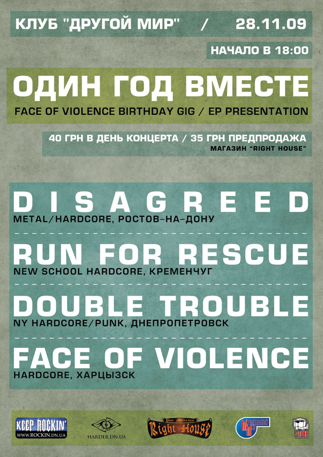 За спиной всего лишь год, а пережито вместе уже было немало, менялись люди, музыка оставалась. В этот день хотели бы видеть всех кто помогал нам, участвовал в группе (полный поименный список будет чуть позже). За время существования нам встречались разные люди и группы, наиболее близкие приедут отметить с нами эту дату. На концерте можно будет приобрести футболки Face of Violence, а так же диски с дебютным и абсолютно новым EP + диски наших групп друзей.
