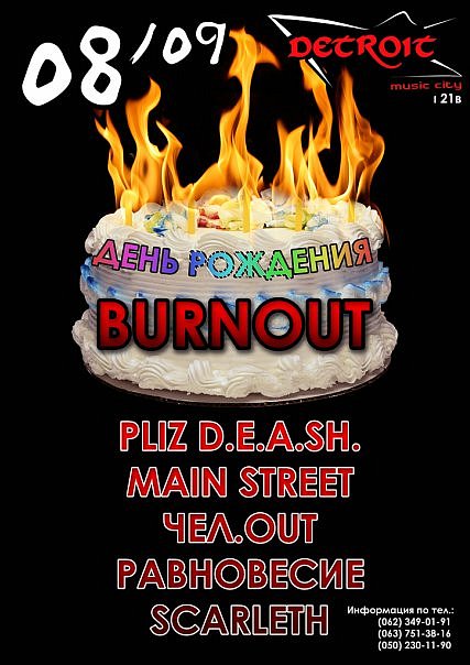 В среду 8-го сентября поздравляем друзей - группу Burnout с Днём Рождения. (IMG:img?url=http://s002.radikal.ru/i200/1009/7b/baa2b5235de4.jpg) DETROIT music city Начало: 19.00 Цена: 20 грн |