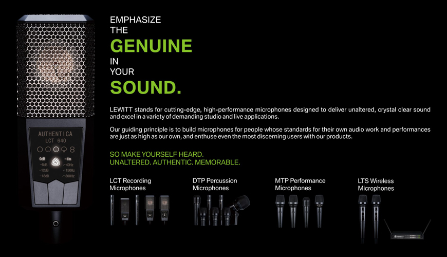 (IMG:img?url=http://allegro.com.ua/files/descr_img896.jpg) Мы всегда стараемся находить что-то интересное и новое для нашего рынка... На этот бренд мы обратили внимание ещё в 2009 году. Смотрели, ходили вокруг да около, изучали и вот наконец решились. Получив положительные рекомендации от студий звукозаписи в Германии, Австрии и США о качестве записи звука этими микрофонами, мы присмотрелись повнимательней, и сами провели независимый тест на международной выставке/форуме MusikMesse 2012! Мы были восхищены услышанным! Качество записей было настолько высоким, что моментально возникал вопрос: почему до этого времени продукция этого бренда не была представлена в нашей стране. Сделав выводы, наша компания заключила эксклюзивный контракт с австрийской фирмой Lewitt Audio для поставок продукции в Украину. (IMG:img?url=http://allegro.com.ua/files/descr_img897.jpg) В наличии профессиональные вокальные, инструментальные и универсальные микрофоны, а также радиосистемы! Обзоры и характеристики микрофонов можно почитать- ЗДЕСЬ!
