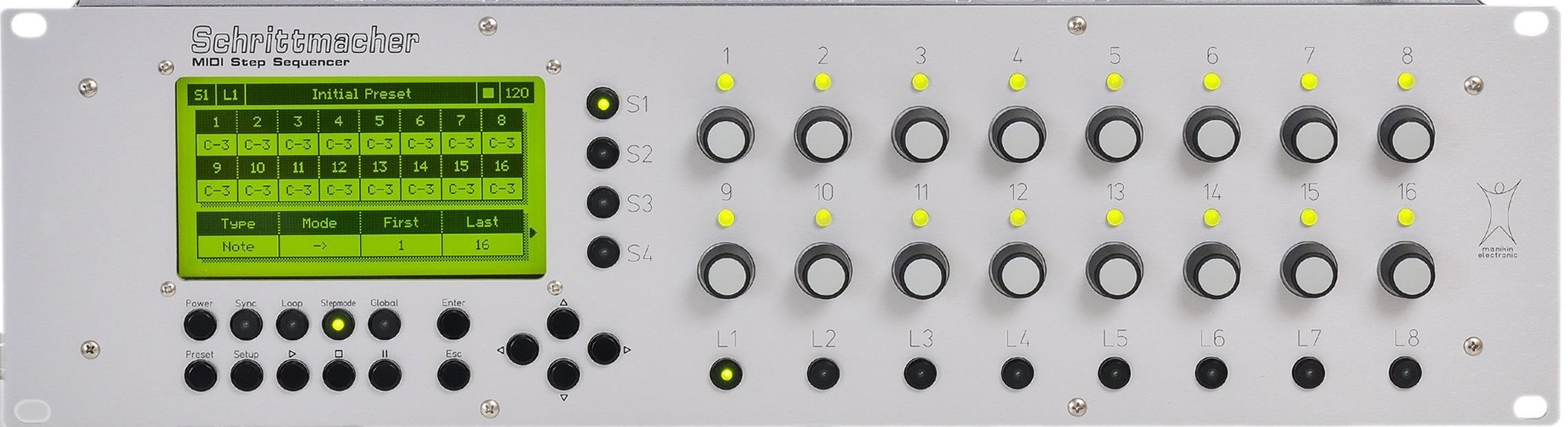 Шаговый секвенсор MANIKIN ELECTRONIC SCHRITTMACHER (IMG:img?url=http://allegro.com.ua/files/store_apendix_large8957_6422.jpg) Шаговый MIDI-секвенсер в рековом исполнении. 16 ступеней, 32 параметрические линейки (трека). ЖК-дисплей 240 x 128 точек. Хранение 30 программ. MANIKIN ELECTRONIC Schrittmacher — классический шаговый MIDI-секвенсор в современном исполнении. 16 шагов, 32 линейки параметров (parameter line, аналог трека в обычном секвенсере), на каждом из которых при помощи 16 pushbutton-энкодеров можно настроить трек по своему вкусу. Каждый из регуляторов отвечает за параметры Note, Velocity, Gate, Len, Midi, Add и Ctrl. Для каждой линейки параметров устанавливаются собственные значения режима воспроизведения (forward, backward, forward/backward, pingpong и random) и скорости воспроизведения. Каждый из регуляторов pushbutton encoder является «бесконечным», т.е. не имеет точки фиксации, и также позволяет путём нажатия выбирать режим воспроизведения шага (play, mute, skip). Дополнительные 28 кнопок на панели Schrittmacher предназначены для дальнейшей обработки набранных ритмических паттернов. Весь ход процесса создания секвенции можно отслеживать на ЖК-дисплее с подсветкой с разрешением 240 x 128 точек. Наличие MIDI-входа позволяет, при необходимости, подключить к модулю мастер-клавиатуру. Секвенсер MANIKIN ELECTRONIC Schrittmacher поддерживает внутреннюю и внешнюю синхронизацию по MIDI clock, позволяет хранить до 30 программных пресетов. Обновление встроенного ПО осуществляется через MIDI-интерфейс. MANIKIN ELECTRONIC Schrittmacher. Рековый модуль 3U. Подключения: MIDI In, 2 x MIDI Out. Габариты: 482 x 132 x 74 мм. Вес 2,5 кг. Цена:15290грн. Также доступны библиотеки сэмплов (всего 6) по цене 870грн.