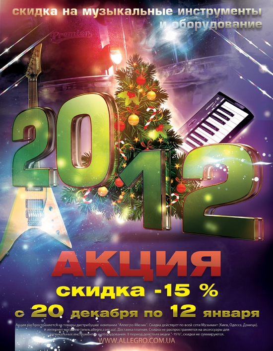 * - Скидка действует по всей сети магазинов Музыкант (Киев, Донецк, Одесса) а также в интернет-магазине www.allegro.com.ua (доставка по всей Украине). Скидка не распространяется на аксессуары для музыкальных инструментов и оборудования. В период действия акции скидки не суммируются.