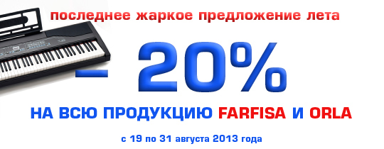 Магазин МУЗЫКАНТ идет Вам на встречу! До конца лета у Вас есть великолепная возможность приобрести любой синтезатор, цифровое пианино или другой товар компаний ORLA и FARFISA со скидкой 20% от стоимости товара!