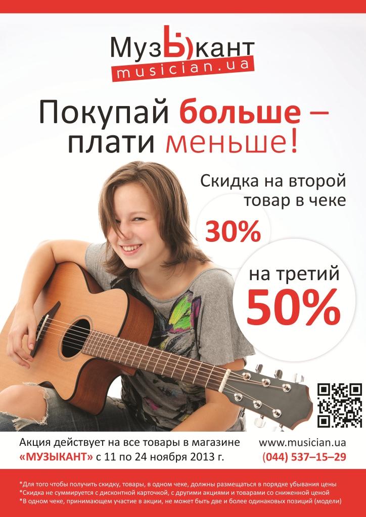*Детали нашей акции: Каждый второй музыкальный товар в чеке Вы покупаете со скидкой 30% Каждый третий, со скидкой 50% Если в чеке много товаров, например, Вы решили купить все музыкальные инструменты и аксессуары (скупить весь магазин… есть же среди нас «шопоголики»? :-) ) И на этот случай все скидки Ваши, а именно, 5 и 6 товары, 8 и 9, 11 и 12, … будут также куплены Вами со скидками 30% и 50% соответственно.