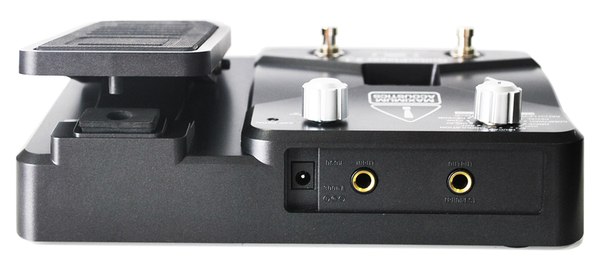 А теперь перейдем к делу! Как только берешь этот процессор в руки, первое, на что обращаешь внимание – это его вес. Действительно легкая штука. Размер соответствующий, его вполне можно переносить в кармане чехла или кейсе. Корпус изготовлен из композитного пластика, а это значит, что повредить его будет не так просто! Дно процессора сделано из листовой стали, пусть и не самой толстой, но все же стали. Резиновые ножки не дадут ему «ползать» по сцене. Дизайн верхней панели весьма «спартанский»: педаль wah/громкости, две кнопки, два регулятора и светодиодный экран на две ячейки.