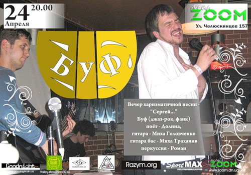 24.04 в 20:00, в арт-кафе "Zoom", группа "БУФ", вечер харизматичной песни - "Сергей..."