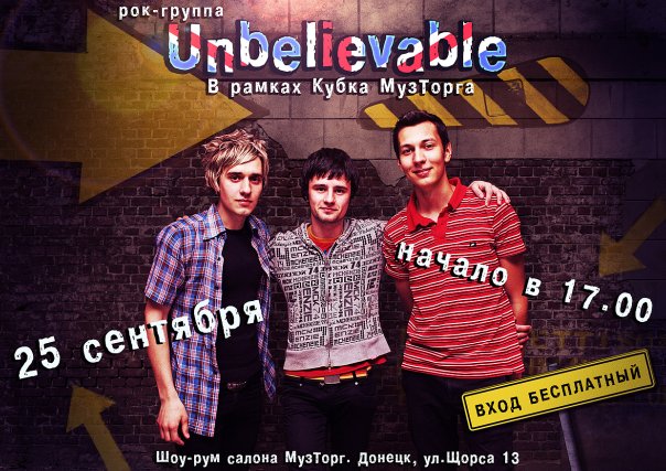 Первыми "Кубок Музторга" открывает горловская группа UNBELIEVABLE. Замечательные музыканты и отличные позитивные люди.