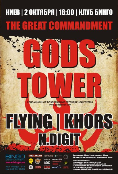 2 октября 2010 года в киевском клубе "Бинго" GODS TOWER отыграет свои лучшие и новые хиты, а The Great Commandment представит одни из лучших и новых групп в своих направлениях. Стоит отметить, что в последний раз GODS TOWER посетили Киев на The Great Commandment в мае 2001 года, незадолго до своего распада. И теперь, спустя 9 лет, они снова с нами!