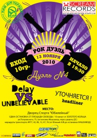 13 ноября, начало в 19:00 Время и местоГород:Донецк, УкраинаРайон:Кировский районАдресПетровского ул., 75АНачало:13 ноя 2010 в 19:30Окончание:13 ноя 2010 в 21:00Контактная информацияТелефон:0956517470 Delay VS UNBELIEVABLE