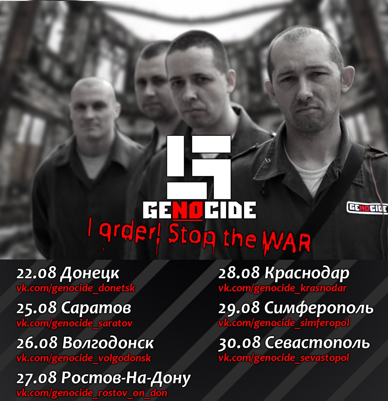 Друзья, скоро отправляемся в небольшой тур, будем всех рады видеть на наших концертах! Make music! Not war! 22 августа, сб - Донецк http://vk.com/genocide_donetsk 25 августа, вт - Саратов http://vk.com/genocide_saratov 26 августа, ср - Волгодонск http://vk.com/genocide_volgodonsk 27 августа, чт - Ростов-на-Дону http://vk.com/genocide_rostov_on_don 28 августа, пт - Краснодар http://vk.com/genocide_krasnodar 29 августа, вс - Симферополь http://vk.com/genocide_simferopol 30 августа, сб - Севастополь http://vk.com/genocide_sevastopol Сообщение отредактировал alex742 - 2.8.2015, 15:57 |