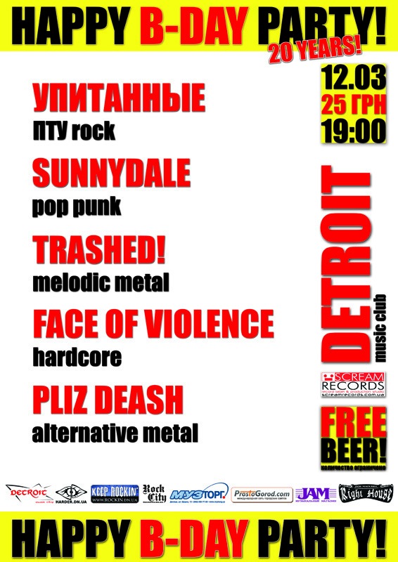 Клуб: Detroit music city Адрес клуба: проспект Ильича, 21В Дата: 12.03.2011 Время: 19:00 Цена: 25 гривенOla! Aloha! Дзенькую! Shalom! Konnichi wa! Guten Morgan! Превед! Меня зовут Антон и я сделаю все возможное, чтобы Ты не упустил(а) шанс посетить вечеринку в честь моего Дня Рождения! Это будет поистине неповторимый вечер полнейшего угара, нескончаемого алкоголя, бескомпромиссной живой музыки и неисчисляемых сюрпризов! В эту субботу мы сможем насладиться: - бесплатное пиво (ограниченное количество) - sunnydale после года молчания в новом звучании и с невероятной энергетикой! - pliz deash с презентацией нового мини-альбома - праздничный, угарный джем (импровизация) - эксклюзивное поздравление от КёртисаВ ЭТОТ ВЕЧЕР КУРЕНИЕ В КЛУБЕ ЗАПРЕЩЕНО УПИТАННЫЕПТУ rockНебритые и толстые выпускники горного техникума. Влезли в огромные кредиты, чтобы купить инструменты. Теперь вынуждены гастролировать с концертами. Одобрены ZZ Top'ом и Buddy Rich'ем. http://vkontakte.ru/club19058266SUNNYDALEpoppy hardcore, pop-punkhttp://vkontakte.ru/club560595После года молчания они возвращаются! Новое, мощное звучание. Ещё больше позитива и огромная лавина энергии. Если в твоих венах кипяток - ты не должен пропустить их выступление!TRASHED!melodic metalhttp://vkontakte.ru/club9051985http://www.myspace.com/thetruetrashedМолодые и подающие надежду резиденты тяжелой сцены донецкого региона. Презентуют мини-альбом и исполнят самые вкусные кавера из своего репертуара. Последний концерт группы.FACE OF VIOLENCEhardcorehttp://vkontakte.ru/club10693248Иногда не хочется экспериментов, нет желания поразить кого-то своим мастерством, завоевать армию поклонников. Хочется нести через музыку то, что бы просто соответствовало твоему мировосприятию, озвучить частичку себя, быть до конца честным перед собой.PLIZ DEASHalternative metalhttp://vkontakte.ru/club14164185Совместный творческий путь гуманоидные захватчики Pliz DEASH начали совсем недавно, всего 12 тысяч парсеков назад. С тех пор не многое изменилось в их жизни, но единый порыв захватить мир и привнести в него музыку сфер объединил их крепкими узами космического браства. ВСЕ ЕЩЁ В СОМНЕНИЯХ!?Оставь немного сил на афтепати! Только для самых близких друзей именинника! В этот вечер мы зажжем и выжжем! Ведь субботний вечер не может пройти иначе, тем более двадцать лет - раз в жизни! Что может быть проще, чем оторваться по полной и разделить свою радость с другими? ПРИДИ, И ПОЗДРАВЬ ДРУГА, БЛЕАТЬ!