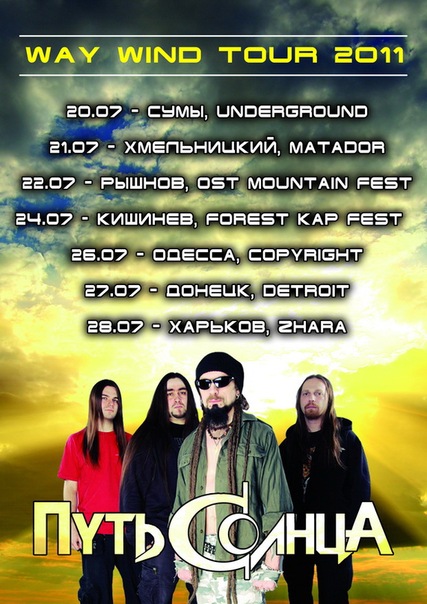 WAY WIND TOUR 2011 ПУТЬ СОЛНЦА (pagan thrash metal, Russia)http://www.putsolnca.ruhttp://www.myspace.com/psolncahttp://vkontakte.ru/club1759006(IMG: img?url=http://cs4922.vk.com/u3296339/136920567/x_ccf183bd.jpg) Одна из первых в России групп, исполняющих музыку в жанре Pagan Thrash - тяжелый металл с языческими текстами и атмосферой безбашенного угара. Благодаря сочетанию этих двух направлений достигается максимальная мощь, драйв и угар, какие только возможны в современной музыке.Группа Путь Солнца образована в 2006, когда вокалист MirRon покинул ряды Butterfly Temple, и решил собрать собственный коллектив.Первый материал был написан довольно быстро, и группа приступила к бурной концертной деятельности, сочиняя материал для дебютной пластинки.Были отыграны концерты с такими группами как СЛОТ, Moray Eel , Butterfly Temple, Rossamahaar, Невидь, Сварга, Tantal , Cryptopsy(can)и множество дрВ феврале 2011 года на студии KIV Rec был записан альбом «Ветер». В работе над альбомом были привлечены Макс Лайко (Manic Depression), который записал соло к некоторым песням. Рома Arsafes (Kartikeya) работал над барабанами. Саунд продюсером и звукоинженером выступил Игорь Королёв (Kiv).В поддержку нового альбома было сыграно множество концертов в разных городах России, в рамках туров «Солнцестояние» вместе с группами Butterfly Temple и Омела, а также тур « Live Undead » с группой Stigmatic Chorus. Группа также выступила хэдлайнером фестиваля «Fire Fest» в Пятигорске. На сегодняшний день в состав группы входят профессиональные и известные музыканты, Бельф (Ashen Light, Stigmatic Chorus, Невидь), Alex «CrownSteel» (Stigmatic Chorus ). Андрей Ищенко! так же выступают: СУРТ (Макеевка) Хорояр (Мариуполь) Steak with BloodСаворБилеты - 40 грн Вход без билета - 50 грн Группы желающие принять участие в концерте пишите в ЛС http://vkontakte.ru/id2789817Начало: 27 июля в 19:00