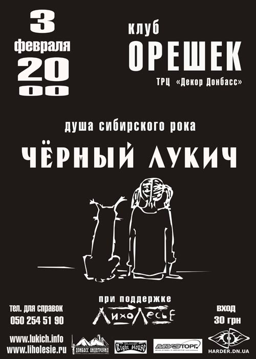 03.02.2012 - г. Донецк, клуб «Орешек» (ТРЦ «Декор Донбасс», ул. Генерала Антонова, 4). При поддержке группы ЛихоЛесье. Начало в 20 - 00. Вход 30 грн.
