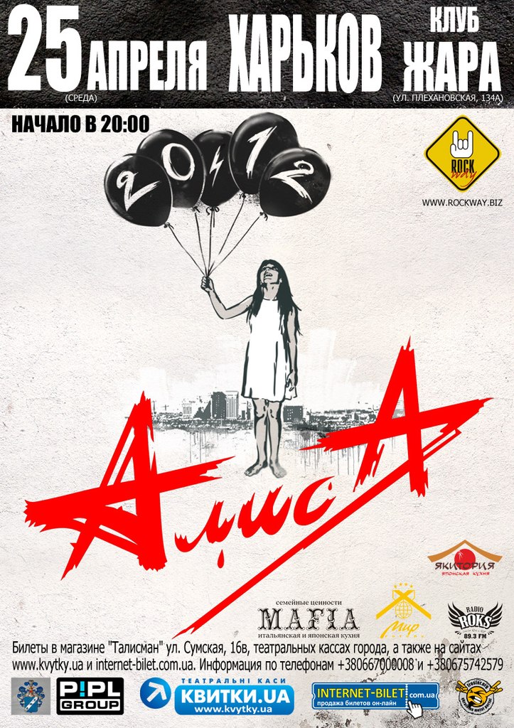 (IMG:img?url=http://cs4349.vk.com/u27093942/-3/z_8bd48559.jpg) Цена билетов в предпродаже: Фан-зона 250 грн VIP(второй этаж, места за столами) 350 грн Билеты будут продаваться: магазин "Талисман" ул. Сумская 16в театральные кассы города Харькова также можно приобрести билеты в интернете на сайтах http://www.kvytky.ua http://www.internet-bilet.com.ua Количество билетов будет строго ограничено и ближе к концерту цена будет расти!!!