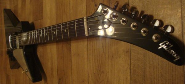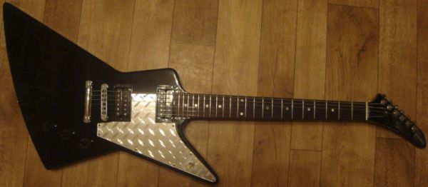 Gibson Explorer 2007-го года выпуска. Общее состояния очень хорошее, гриф и лады в идеале (раз в пол года проводилась пропитка лимонным маслом dunlop). Инструмент суперский. Куплен в США. Не смотря на форму очень эргономичный (здесь вообще разрыв шаблона). Звук на перегрузке - как дубинкой по башке, чистый нэк - очень тёплый, чистый в средней позиции - жирная середина, блюз наяривать очень круто. В общем можно играть всё, от метала до джаза. Оригинальный белый пикгуард был заменен на кастумшоповский "diamond plate", как у гитариста Amon Amarth.