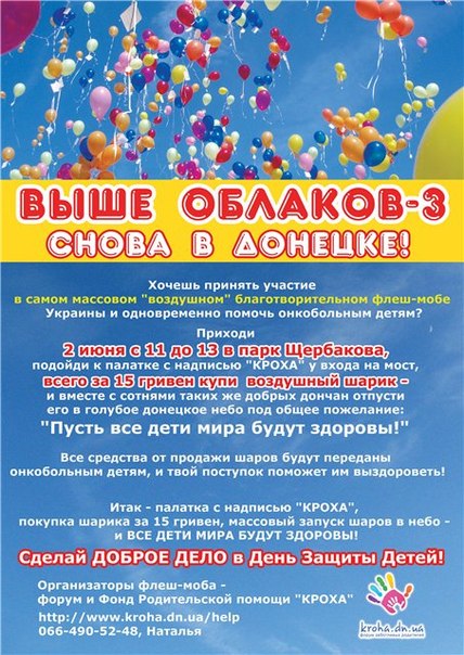 Грашдане, не проходим мимо! Оччень важная тема! Приходите, приводите своих друзей, покупайте шарики (а можно просто денежку жертвовать, на акции будут копилки стоять) - каждые 10-15 гривен это ваш вклад в ЖИЗНЬ ребенка!