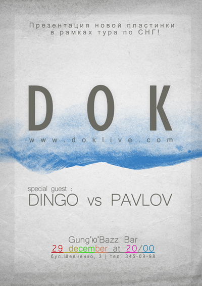 DOK (Киев-Донецк, Украина)Их музыка не поддается жанровым определениям – в ней умело сочетаются и гаражный панк, и экспериментальный джаз… Нарушая все правила и стереотипы, группа живет на два города и ведет активную гастрольную деятельность на территории СНГ. Живые концерты DOK поражают своей дерзкой и оголтелой энергией.