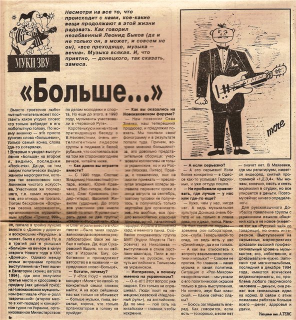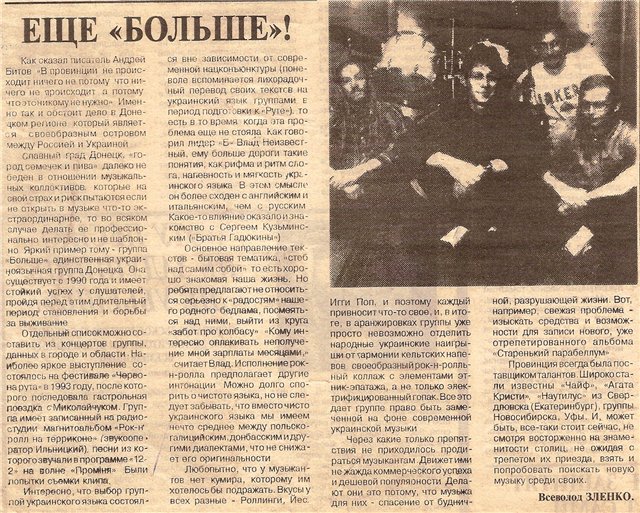 Группа "Більше" ("Больше") была образована Владимиром Неизвестным в г. Донецк (Украина), в конце 80-х годов. Тогда же, в одном из местных дворцов культуры, а именно в ДК им. Ленина, были осуществлены первые записи коллектива. В 1988 году состоялось выступление "Больше" в ДК им. Куйбышева, в рамках отчётного концерта местного рок-клуба. Один из первых альбомов был записан в г. Докучаевск, при участии: Владимира Неизвестного (гитара, вокал), Константина Комиссарова - ударные, Сергея Сокуренко - сопилка, флейта, бэк-вокал, акустическая гитара, клавиши и других. В период времени с 1993-1995 г. на Донецком областном радио, было записано 3 замечательных альбома - талантливым звукоинженером - И. Ильницким. Участие в рабочем процессе принимали: Олег Кривоконь, Юрий Кравченко, Василий Живиляк и др. Данные записи распространялись на аудиокассетах во многом благодаря лидеру МТЦ "Хьюзтон", и одновременно тогдашнему директору группы - Всеволоду Зленко. В 2000-м году группа записала свой первый альбом на профессиональной студии в г. Киев. В начале 2000-х местный телеканал - "КРТ" снимает для группы первый клип. В 2006-м на студии "Fat records", г. Донецк - было записано 3 песни. В 2011-м году Дмитрий Афанасьев ("Scream records") осуществил ремастеринг данного проекта. Последний альбом - "Пломба" был записан в 2012 году, на студии "Scream records" и издан ограниченным тиражом. В самом начале своей деятельности группа исполняла песни исключительно на русском языке, но начиная с 1993 года в репертуаре коллектива стали появляться и украиноязычные произведения, чем была вызвана волна критики в Донецке, но после встречи с группой "Брати Гадюкіни" ("Братья Гадюкины") музыканты ещё раз убедились, что они находятся на верном пути. Определённую классификацию стилю сложно подобрать для группы "Больше". Музыканты имеют многолетний концертный опыт и объездили с гастролями большую часть Украины. Песни группы звучали в эфирах различных радиостанций Украины, в прессе сохранилось множество упоминаний о данном коллективе. Нынешний состав: Владимир Неизвестный - гитара, вокал Сергей Сокуренко - бас Василий Живиляк - ударные Альбомография: 1985-1988 - Концертные записи 1990 - Ночной город 1991 - Демо 1991-1992 - Ночной город 2 1992 - Сборник 1993 - Рок-н-ролл на терiконi 1994 - Старенький парабелум 1995 - Кiт с блакитними очима 1997 - Несподiвана весна 1998 - Ужин дилетанта (Радио ''Да'') 2000 - Абстененцiя 2006 - Демо 2012 - Пломба Скачать - http://rutracker.org/forum/viewtopic.php?t=4276837, http://www.ex.ua/get/901117583867/40784030 Слушать онлайн - http://vk.com/vhs_video группа вконтакте - http://vk.com/bilshe Сообщение отредактировал zaton - 18.8.2013, 14:23 |