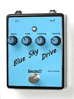 «Blue Sky Drive» - это авторская примочка, разновидность классического эффекта «Over Drive», выполненная по оригинальной схеме. Предоставляет исполнителю теплое певучее звучание с небольшим уровнем искажений. Ориентирован на блюз и классический рок. Выполнен на полупроводниковых приборах.