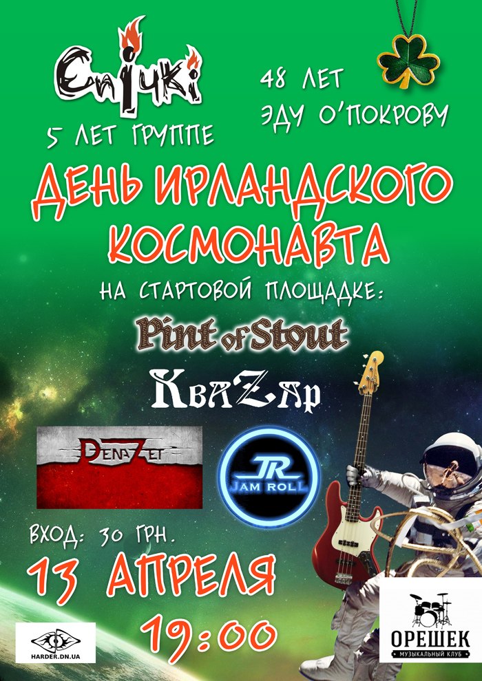 13 апреля все прогрессивное человечество отмечает большой праздник - День Ирландского Космонавта. В этот же день торжественно отмечают свои ДР группа Спiчкi, которой в этом году исполнится 5 лет, и Великий Злобный Филид, трижды просветленый, Торук Макто и пароход Эд Покров.