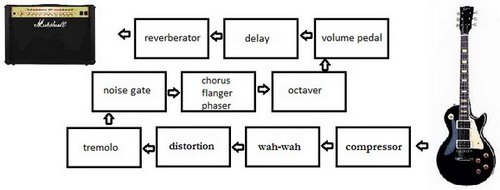 ТЮНЕР --> Компрессор / педаль громкости / бустер --> Квакушка / эквалайзер --> фейзер, хорус/флэнжер и эффекты вибрато --> Дисторшн, орвердрайв и фузз --> Delay/reverb --> Тремоло