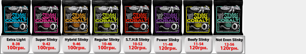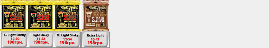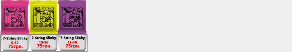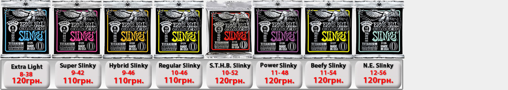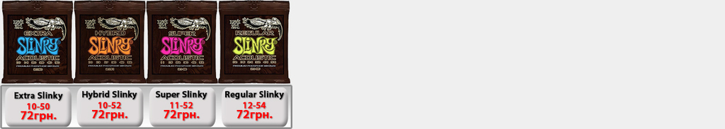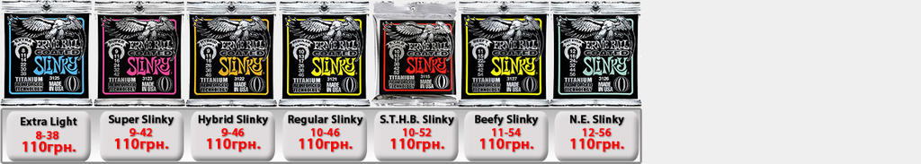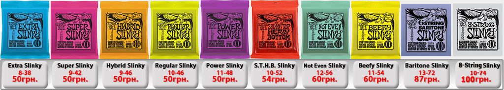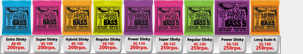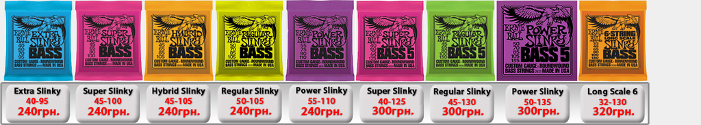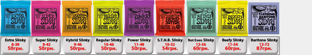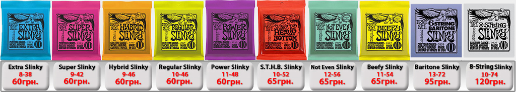 Ernie Ball Slinky Electric для электрогитары. Производство США. (IMG:img?url=http://s6.postimg.org/5s7wd19lt/Ernie_Ball_Slinky_1.jpg) Струны Ernie Ball 2225 Nickel Extra Slinky 8-38 - 50грн. Струны Ernie Ball 2223 Super Slinky 9-42 - 50грн. Струны Ernie Ball 2222 Hybrid Slinky 9-46 - 50грн. Струны Ernie Ball 2221 Regular Slinky 10-46 - 50грн. Струны Ernie Ball 2220 Power Slinky 11-48 - 50грн. Струны Ernie Ball 2215 Skinny Top Heavy Bottom 10-52 - 54грн. Струны Ernie Ball 2627 Beefy Slinky 11-54 - 60грн. Струны Ernie Ball 2626 Not Even Slinky Drop Tuning 12-56 - 60грн. Струны Ernie Ball 2839 Baritone 6 string Slinky 13-72 - 87грн. 7-String Струны Ernie Ball 2623 Super 7-string Slinky 9-52 - 70грн. Струны Ernie Ball 2621 Regular 7 string Slinky 10-56 - 70грн. Струны Ernie Ball 2620 Power 7-string Slinky 11-58 - 70грн. 8-String Струны Ernie Ball 2625 8-String Slinky 10-74 - 100грн. Ernie Ball RPS Slinky Electric для электрогитары. Производство США. Струны Ernie Ball 2240 RPS Regular Slinky 10-46 - 60грн. Струны Ernie Ball 2242 RPS Power Slinky 11-48 - 60грн. Ernie Ball Pure Nickel Slinky Electric для электрогитары. Производство США. Струны Ernie Ball 2251 Pure Nickel Rock N Roll Regular Slinky 10-46 - 60грн. Ernie Ball Titanium Slinky Electric для электрогитары. Производство США. (IMG:img?url=http://s30.postimg.org/v3j8yguld/Ernie_Ball_Titanium_Nash_Rock.jpg) Струны Ernie Ball 3125 Titanium Extra Slinky 8-38 - 110грн. Струны Ernie Ball 3123 Titanium Super Slinky 9-42 - 110грн. Струны Ernie Ball 3122 Titanium Hybrid Slinky 9-46 - 110грн. Струны Ernie Ball 3121 Titanium Regular Slinky 10-46 - 110грн. Струны Ernie Ball 3115 Titanium S.T.H.B. Slinky 10-52 - 110грн. Струны Ernie Ball 3120 Titanium Power Slinky 11-48 - 110грн. Струны Ernie Ball 3127 Titanium Beefy Slinky 11-54 - 110грн. Струны Ernie Ball 3126 Titanium Not Even Slinky 12-56 - 110грн. Ernie Ball Cobalt Slinky Electric для электрогитары. Производство США. (IMG:img?url=http://s14.postimg.org/k6j9q9kht/Ernie_Ball_Slinky_Cobalt.jpg) Струны Ernie Ball 2725 Cobalt Slinky 8-38 - 100грн. Струны Ernie Ball 2723 Cobalt Slinky 9-42 - 100грн. Струны Ernie Ball 2722 Cobalt Slinky 9-46 - 100грн. Струны Ernie Ball 2721 Cobalt Slinky 10-46 - 100грн. Струны Ernie Ball 2715 Cobalt Slinky 10-52 - 120грн. Струны Ernie Ball 2720 Cobalt Slinky 11-48 - 120грн. Струны Ernie Ball 2727 Cobalt Slinky 11-54 - 120грн. Струны Ernie Ball 2726 Cobalt Slinky 12-56 - 120грн. 7-String Струны Ernie Ball 2728 Cobalt 7-String Slinky 10-56 - 110грн. Струны Ernie Ball 2729 Cobalt 7-String Slinky 11-58 - 110грн. Струны Ernie Ball 2730 Cobalt 7-String Slinky 10-62 - 120грн. Ernie Ball Nickel Wound Custom Gauge Wound G Electric для электрогитары. Производство США. Струны Ernie Ball 2210 Custom Gauge Wounded 3-rd G 10-50 - 80грн. Струны Ernie Ball 2208 Custom Gauge Wounded 3-rd G 11-52 - 80грн. Струны Ernie Ball 2206 Custom Gauge Wounded 3-rd G 12-54 - 80грн. Ernie Ball Earthwood Acoustic для акустической гитары. Производство США. Струны Ernie Ball 2006 Earthwood Slinky 10-50 - 69грн. Струны Ernie Ball 2004 Earthwood Slinky 11-52 - 69грн. Струны Ernie Ball 2003 Earthwood Slinky 12-54 - 69грн. Ernie Ball Acoustic Phosphor Slinky для акустической гитары. Производство США. (IMG:img?url=http://s24.postimg.org/3q2t9gydx/Ernie_Ball_Slinky_Acoustic_BAckground.jpg) Струны Ernie Ball 2150 Acoustic Extra Phosphor Slinky 10-50 - 60грн. Струны Ernie Ball 2151 Acoustic Hybrid Phosphor Slinky 10-52 - 60грн. Струны Ernie Ball 2148 Acoustic Super Phosphor Slinky 11-52 - 60грн. Струны Ernie Ball 2146 Acoustic Reg. Phosphor Slinky 12-54 - 60грн. Ernie Ball Titanium Slinky Acoustic для акустической гитары. Производство США. Струны Ernie Ball Slinky Acoustic Titanium 2156 12-54 -198грн. Струны Ernie Ball Slinky Acoustic Titanium Phosphor Bronze 3150 10-50 -198грн. Ernie Ball Everlast Coated Acoustic Bronze для акустической гитары. Производство США. (IMG:img?url=http://s2.postimg.org/e8dy2qnbt/Ernie_Ball_Everlast_acoustic.jpg) Струны Ernie Ball Everlast Coated Acoustic Phosphor Bronze 2548 11-52 Light -198грн. Струны Ernie Ball Everlast Coated Acoustic Phosphor Bronze 2546 12-54 Medium Light -198грн. Струны Ernie Ball Everlast Coated Acoustic 80/20 Bronze Alloy 2558 11-52 Light -198грн. Струны Ernie Ball Everlast Coated Acoustic 80/20 Bronze Alloy 2556 12-54 Medium Light -198грн. Ernie Ball Nylon Нейлоновые для классической гитары. Производство США. Струны Ernie Ball 2406 Ernesto Palla Black Nylon & Silver 28-42 - 78грн. Струны Ernie Ball 2409 Ernesto Palla Black Nylon & Gold 28-42- 78грн. Ernie Ball Slinky Bass для бас гитары. Производство США. (IMG:img?url=http://s13.postimg.org/vavou7h87/Ernie_Ball_Slinky_Bass.jpg) Струны Ernie Ball 2835 Bass Roundwound Extra Slinky 40-95 - 200грн. Струны Ernie Ball 2834 Bass Roundwound Super Slinky 45-100 - 200грн. Струны Ernie Ball 2833 Bass Roundwound Hybrid Slinky 45-105 - 200грн. Струны Ernie Ball 2832 Bass Roundwound Regular Slinky 50-105 - 200грн. Струны Ernie Ball 2831 Bass Roundwound Power Slinky 55-110 - 200грн. Струны Ernie Ball 2824 B