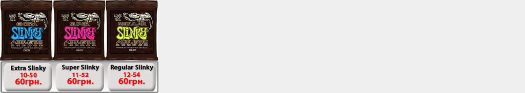Ernie Ball Slinky Electric для электрогитары. Производство США. (IMG:img?url=http://s29.postimg.org/76ycboivr/Ernie_Ball_Slinky_2014_2.jpg) (IMG:img?url=http://s18.postimg.org/fuvoewspl/Ernie_Ball_7_String_Slinky_75.jpg) Струны Ernie Ball 2225 Nickel Extra Slinky 8-38 - 60грн. Струны Ernie Ball 2223 Super Slinky 9-42 - 60грн. Струны Ernie Ball 2222 Hybrid Slinky 9-46 - 60грн. Струны Ernie Ball 2221 Regular Slinky 10-46 - 60грн. Струны Ernie Ball 2220 Power Slinky 11-48 - 60грн. Струны Ernie Ball 2215 Skinny Top Heavy Bottom 10-52 - 65грн. Струны Ernie Ball 2627 Beefy Slinky 11-54 - 65грн. Струны Ernie Ball 2626 Not Even Slinky Drop Tuning 12-56 - 65грн. Струны Ernie Ball 2839 Baritone 6 string Slinky 13-72 - 95грн. 7-String Струны Ernie Ball 2623 Super 7-string Slinky 9-52 - 75грн. Струны Ernie Ball 2621 Regular 7 string Slinky 10-56 - 75грн. Струны Ernie Ball 2620 Power 7-string Slinky 11-58 - 75грн. 8-String Струны Ernie Ball 2625 8-String Slinky 10-74 - 120грн. Ernie Ball RPS Slinky Electric для электрогитары. Производство США. Струны Ernie Ball 2240 RPS Regular Slinky 10-46 - 66грн. Струны Ernie Ball 2242 RPS Power Slinky 11-48 - 66грн. Ernie Ball Pure Nickel Slinky Electric для электрогитары. Производство США. Струны Ernie Ball 2251 Pure Nickel Rock N Roll Regular Slinky 10-46 - 60грн. Ernie Ball Titanium Slinky Electric для электрогитары. Производство США. (IMG:img?url=http://s21.postimg.org/6f5vnnzzr/Ernie_Ball_Titanium_110_120.jpg) Струны Ernie Ball 3125 Titanium Extra Slinky 8-38 - 120грн. Струны Ernie Ball 3123 Titanium Super Slinky 9-42 - 110грн. Струны Ernie Ball 3122 Titanium Hybrid Slinky 9-46 - 110грн. Струны Ernie Ball 3121 Titanium Regular Slinky 10-46 - 110грн. Струны Ernie Ball 3115 Titanium S.T.H.B. Slinky 10-52 - 120грн. Струны Ernie Ball 3120 Titanium Power Slinky 11-48 - 120грн. Струны Ernie Ball 3127 Titanium Beefy Slinky 11-54 - 120грн. Струны Ernie Ball 3126 Titanium Not Even Slinky 12-56 - 120грн. Ernie Ball Cobalt Slinky Electric для электрогитары. Производство США. (IMG:img?url=http://s29.postimg.org/r7u3b777b/Ernie_Ball_Slinky_Cobalt_120.jpg) Струны Ernie Ball 2725 Cobalt Slinky 8-38 - 120грн. Струны Ernie Ball 2723 Cobalt Slinky 9-42 - 120грн. Струны Ernie Ball 2722 Cobalt Slinky 9-46 - 120грн. Струны Ernie Ball 2721 Cobalt Slinky 10-46 - 120грн. Струны Ernie Ball 2715 Cobalt Slinky 10-52 - 125грн. Струны Ernie Ball 2720 Cobalt Slinky 11-48 - 125грн. Струны Ernie Ball 2727 Cobalt Slinky 11-54 - 125грн. Струны Ernie Ball 2726 Cobalt Slinky 12-56 - 125грн. 7-String Струны Ernie Ball 2728 Cobalt 7-String Slinky 10-56 - 135грн. Струны Ernie Ball 2729 Cobalt 7-String Slinky 11-58 - 135грн. Струны Ernie Ball 2730 Cobalt 7-String Slinky 10-62 - 145грн. Ernie Ball Nickel Wound Custom Gauge Wound G Electric для электрогитары. Производство США. Струны Ernie Ball 2210 Custom Gauge Wounded 3-rd G 10-50 - 81грн. Струны Ernie Ball 2208 Custom Gauge Wounded 3-rd G 11-52 - 81грн. Струны Ernie Ball 2206 Custom Gauge Wounded 3-rd G 12-54 - 81грн. Ernie Ball Earthwood Acoustic для акустической гитары. Производство США. Струны Ernie Ball 2006 Earthwood Slinky 10-50 - 80грн. Струны Ernie Ball 2004 Earthwood Slinky 11-52 - 80грн. Струны Ernie Ball 2003 Earthwood Slinky 12-54 - 80грн. Ernie Ball Acoustic Phosphor Slinky для акустической гитары. Производство США. (IMG:img?url=http://s7.postimg.org/q6asrt9sr/Ernie_Ball_Slinky_Acoustic_BAckground_72.jpg) Струны Ernie Ball 2150 Acoustic Extra Phosphor Slinky 10-50 - 72грн. Струны Ernie Ball 2151 Acoustic Hybrid Phosphor Slinky 10-52 - 72грн. Струны Ernie Ball 2148 Acoustic Super Phosphor Slinky 11-52 - 72грн. Струны Ernie Ball 2146 Acoustic Reg. Phosphor Slinky 12-54 - 72грн. Ernie Ball Titanium Slinky Acoustic для акустической гитары. Производство США. Струны Ernie Ball Slinky Acoustic Titanium 2156 12-54 -198грн. Струны Ernie Ball Slinky Acoustic Titanium Phosphor Bronze 3150 10-50 -198грн. Ernie Ball Everlast Coated Acoustic Bronze для акустической гитары. Производство США. (IMG:img?url=http://s2.postimg.org/e8dy2qnbt/Ernie_Ball_Everlast_acoustic.jpg) Струны Ernie Ball Everlast Coated Acoustic Phosphor Bronze 2548 11-52 Light -198грн. Струны Ernie Ball Everlast Coated Acoustic Phosphor Bronze 2546 12-54 Medium Light -198грн. Струны Ernie Ball Everlast Coated Acoustic 80/20 Bronze Alloy 2558 11-52 Light -198грн. Струны Ernie Ball Everlast Coated Acoustic 80/20 Bronze Alloy 2556 12-54 Medium Light -198грн. Ernie Ball Nylon Нейлоновые для классической гитары. Производство США. Струны Ernie Ball 2406 Ernesto Palla Black Nylon & Silver 28-42 - 78грн. Струны Ernie Ball 2409 Ernesto Palla Black Nylon & Gold 28-42- 78грн. Ernie Ball Slinky Bass для бас гитары. Производство США. (IMG:img?url=http://s11.postimg.org/v2urz0df7/Ernie_Ball_Slinky_Bass_2014_1.jpg) Струны Ernie Ball 2835 Bass Roundwound Extra Slinky 40-95 - 240грн. Струны Ernie Ball 2834 Bass Roundwound Super Slinky 45-100 - 240грн. Струны Ernie Ball 2833 Bass Roundwound Hybrid Slinky 45-105 - 240грн. Струны Ernie Ball 2832 Bass Roundwound Regular Slinky 50-105 - 240грн. Струн