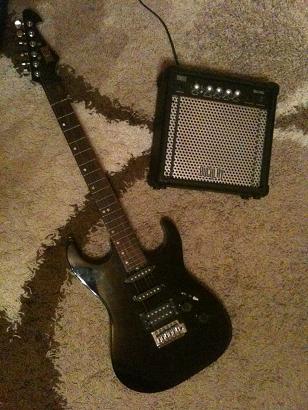 В комплекте гитара, чехол, ремень, тюнер, комбик.