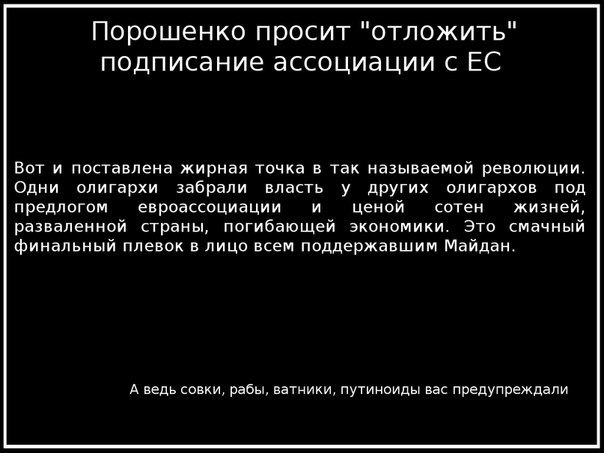 Цитата(Driverson @ 29.5.2014, 20:17)  "три эти клоуна таки подписали свой союз азиопейский" что за привычка обзывать успешных людей? это комплексы?