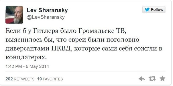 Цитата(Tourist @ 7.5.2014, 0:57)  из Путина такое пугало сделали украинские недоСМИ... подозрительно это "Мне нужны враги" Внутреннего врага рисовать сложнее, а внешнего, тем более соседа - запросто. Цитата(Alexx777 @ 7.5.2014, 12:13)  плюс, не в качестве членов комиссии, а что-то вроде наблюдателей и сторожей. У нас в школе 3 участка. Кто на них будет работать - я хз. Но вряд ли мы. Хотя, я ни в чем сейчас не уверен. Спрашивал у маман, говорит их вообще никуда не привлекали ни в какие комиссии. В школе два участка, за подготовку к голосованию ничего не слышно. Кто и как будет проводить - нипанянта. Цитата(Эд @ 7.5.2014, 12:49)  А вот что реально пугает, так это возросшая истерия в инете с призывами идти и резать всех, кто под триколорами. Сам сегодня выхватил. Причем хер докажешь, что я сам против триколора! Не ебет! "Ты против майдана - значит, ты за Рашу! Значит, мы и тебя порежем!". Такие дела... А я вот видел тоже самое, но про украинцев, в разных версиях от "тех кто за едину" до "тех кто всё ещё считает себя украинцем", что мол если они всё ещё не изменили своё мнение - "значит они пособники хунты и поддерживают тех кто сжёг людей, а значит этих мразей нужно мочить". Ну и про "лечение украинства хирургическими инструментами" ещё до Одессы было. Цитата(Alexx777 @ 7.5.2014, 13:21)  Короче, веселье только начинается. Если народ будет счастлив, если в понедельник появятся русские танки - то манипуляция сознанием удалась. Ну часть будет счтаслива это 146%. Тем более что результат референдума нарисуют. Вообще очень много вопросов связанных с референдумом. Начиная с организации и заканчивая разрозненной позицией проукраинских масс. Одни говорят мол референдум незаконный поэтому идти не надо, с другой стороны не проголосуешь против - будет выглядеть как будто тут все за.