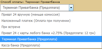 Таким образом как на скриншоте ниже, выбираете оплату через терминал приватбанка и подтверждаете заказ, после чего на почту вам приходит письмо в котором ссылка - Инструкция по оплате через терминал Приватбанка. Оплата производится через терминал Приватбанка на расчетный счет в Приватбанке Назначение платежа: "Оплата товара" (без указания наименования) – Обязательно в такой форме Подробнее смотрите в группе в обсуждении работы нашего магазина - https://vk.com/topic-54436621_31334145?post=124 (IMG:img?url=https://s13.postimg.org/vyyqnqz47/Terminal_privatbanka_predoplata.jpg) |